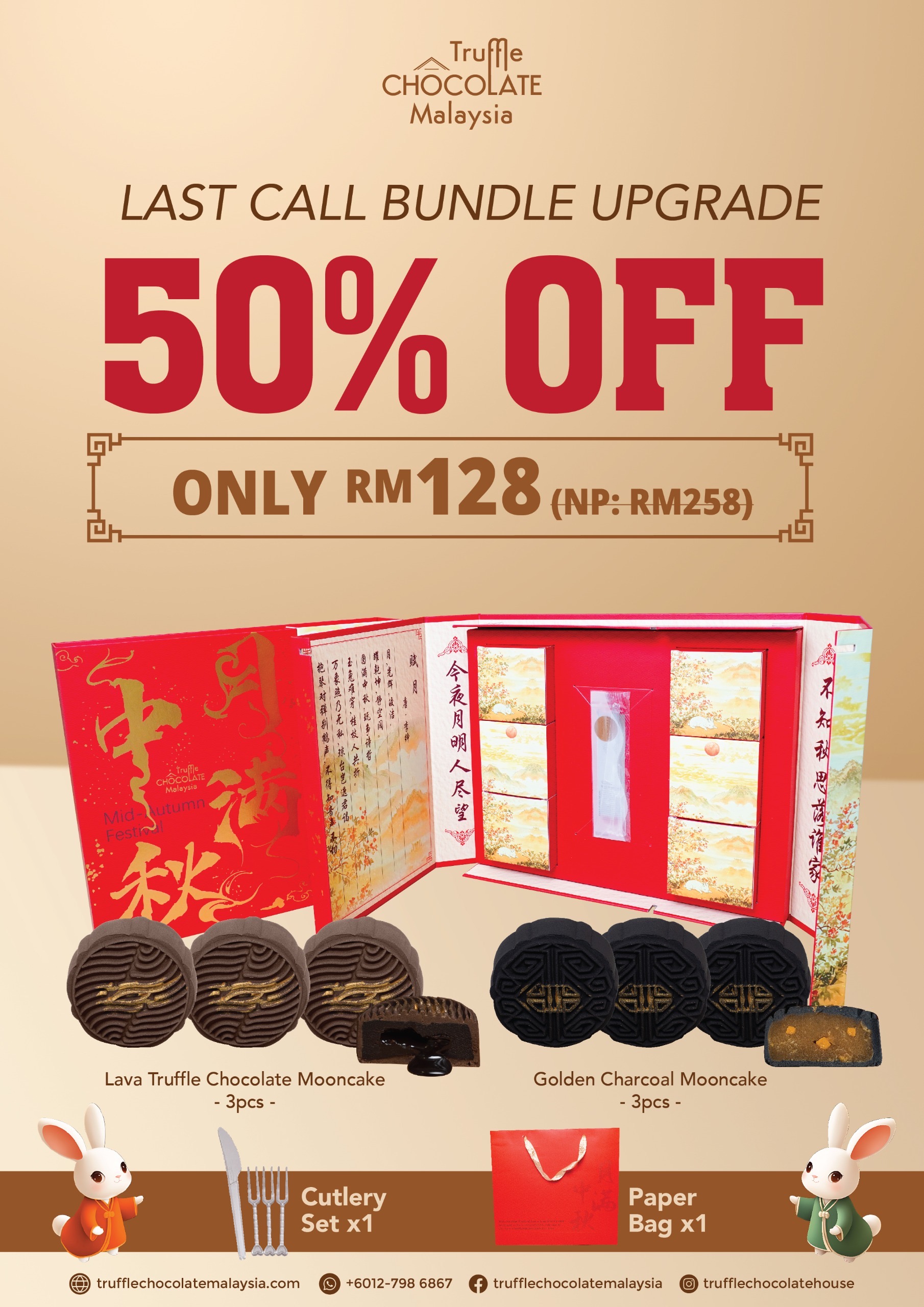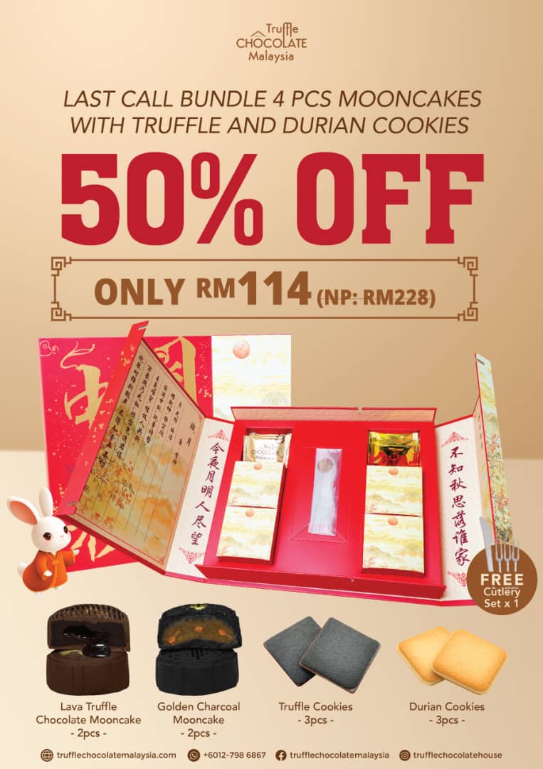 还在烦恼买什么吗? Truffle Chocolate Malaysia 都给你准备好啦! 无论送礼还是自己和家人吃,都超级合适啦~ ————————————————————————————————— Classic Mooncake Set (4pcs)– RM64 (原价 RM128) • 1pc Lava Truffle Mooncake • 1pc Charcoal Mung Bean Mooncake • 1pc Durian Mooncake • 1pc Red Bean Mooncake Exclusive Bundle (with FREE Cutlery Set)– RM114 (原价 RM228) • 2 Lava Truffle Chocolate Mooncakes • 2 Golden Charcoal Mooncakes • 3 Truffle Cookies • 3 Durian Cookies Exclusive Mooncake Bundle – RM128 (原价 RM258) • 3 pcs Lava Truffle Chocolate Mooncake – rich, gooey chocolate indulgence • 3 pcs Golden Charcoal Mooncake – bold flavors with golden fillings • 1 Premium Cutlery Set • 1 Personalised Mooncake Paper Bag ————————————————————————————————— 限时优惠,售完即止! 免费快递:2-3 个工作日送达 急单配送:Lalamove(费用依地址而定☺️) 📩马上预订,不要错过啦~ 🌐www.trufflechocolatemalaysia.com 📞+6012-798 6867
